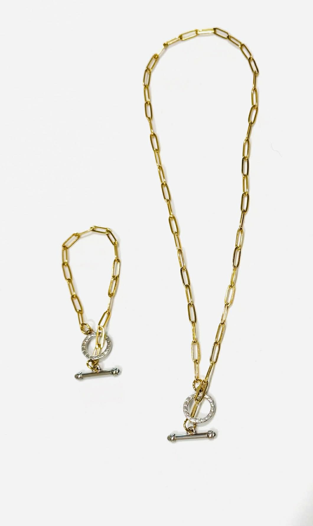 Everyone needs a little gold color with this perfect everyday necklace/bracelet stainless steel paperclip chain set with detailed toggle clasp—a waterproof, tarnish-proof, hypoallergenic design made for lasting shine. This modern paperclip chain is crafted from high-quality stainless steel and features a chic toggle closure, making it ideal for layering or wearing solo. A must-have minimalist chain for women who want durable, luxury jewelry that won’t fade or discolor.