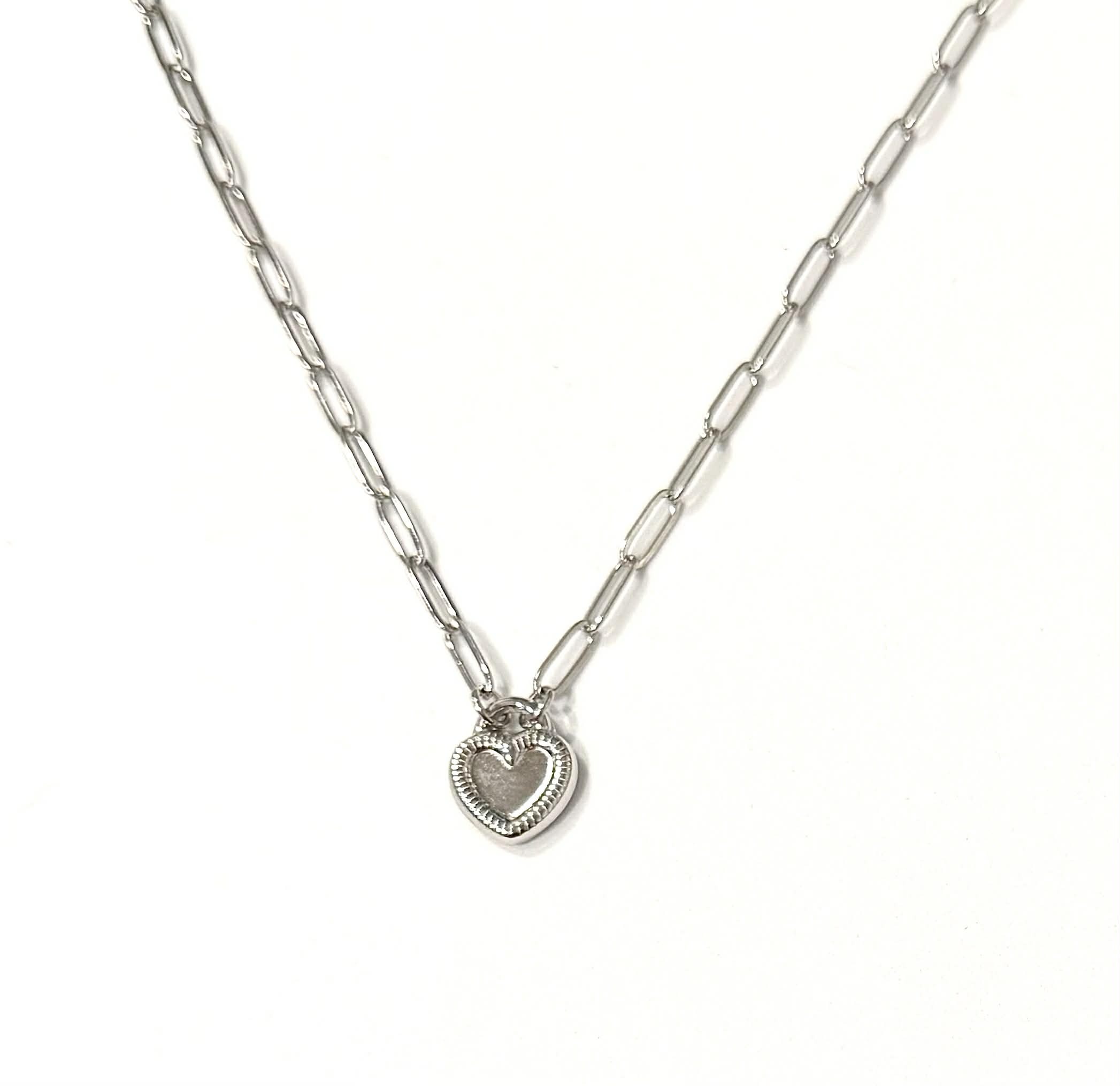 This stainless steel heart necklace features a modern paperclip chain paired with a polished heart charm for a timeless yet on-trend look. Crafted from high-quality stainless steel, it’s tarnish-free, durable, and designed for everyday wear. The bold paperclip chain adds a contemporary edge, while the heart detail keeps it effortlessly feminine—perfect worn solo or layered with your favorite pieces. Find the matching bracelet here Stainless Steel Silver Color Heart Bracelet With Paperclip Chain
